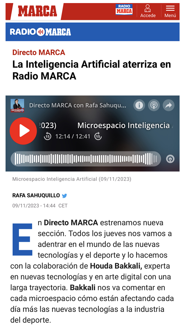 Con Rafa Sahuquillo, iniciamos en 2023 un innovador y pionero espacio donde nuestra compañera de radio era la IA. Deporte, nuevas tecnologías e innovación son los temas abordados en Radio Marca.